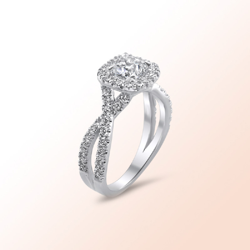 Cushion Cut Center Diamond: 0.90Ct. Color: H, Clarity: Si1 Certified by GIA. Laser inscription.