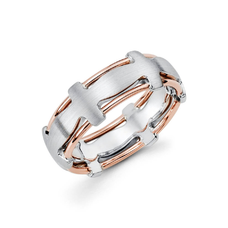 8mm 14k two tone white gold men's wedding band features rose gold wire on the inside.