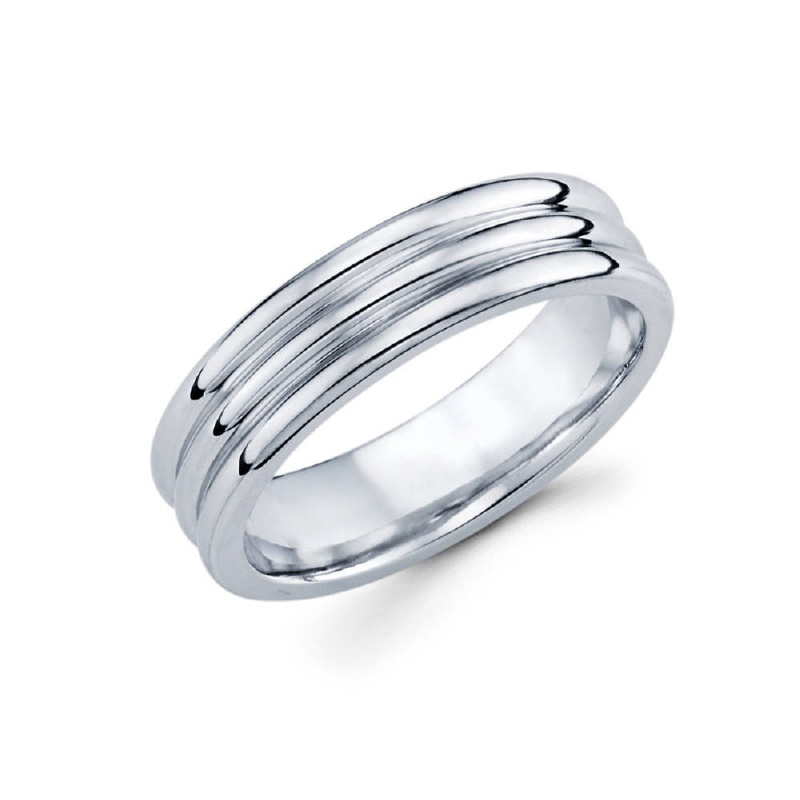 6mm 14k white gold high polish finished men's wedding band contains milgrain in between the parallel cut and gives off the illusion of three rings in one.