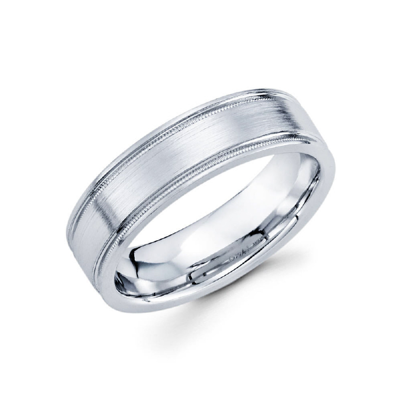 6mm 14k white gold satin finished men's wedding band contains two parallel milgrain carved lines.