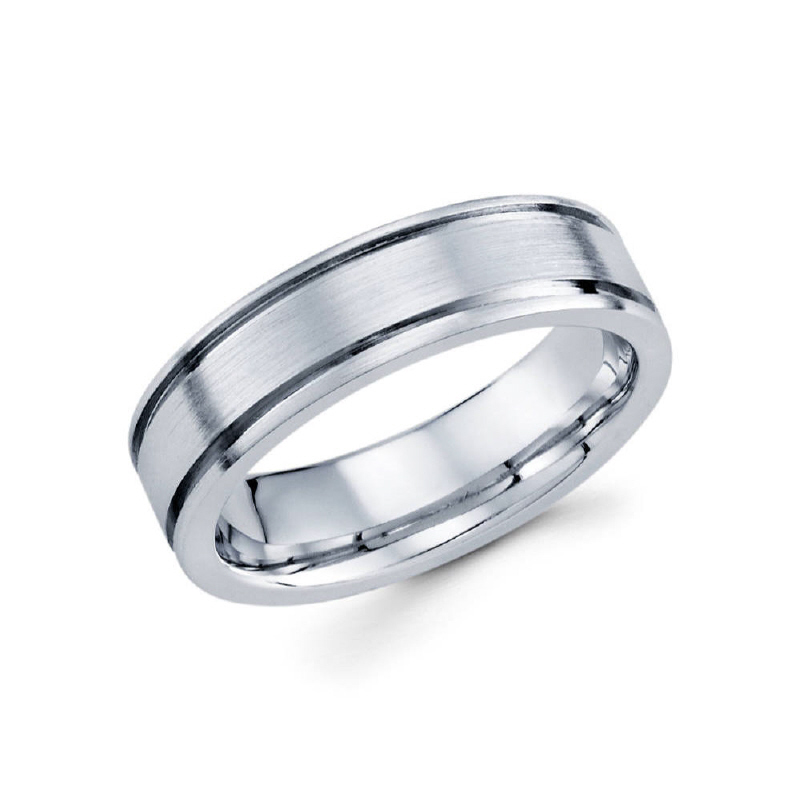 6mm 14k white gold satin finished men's wedding band contains two parallel diamond cut lines.