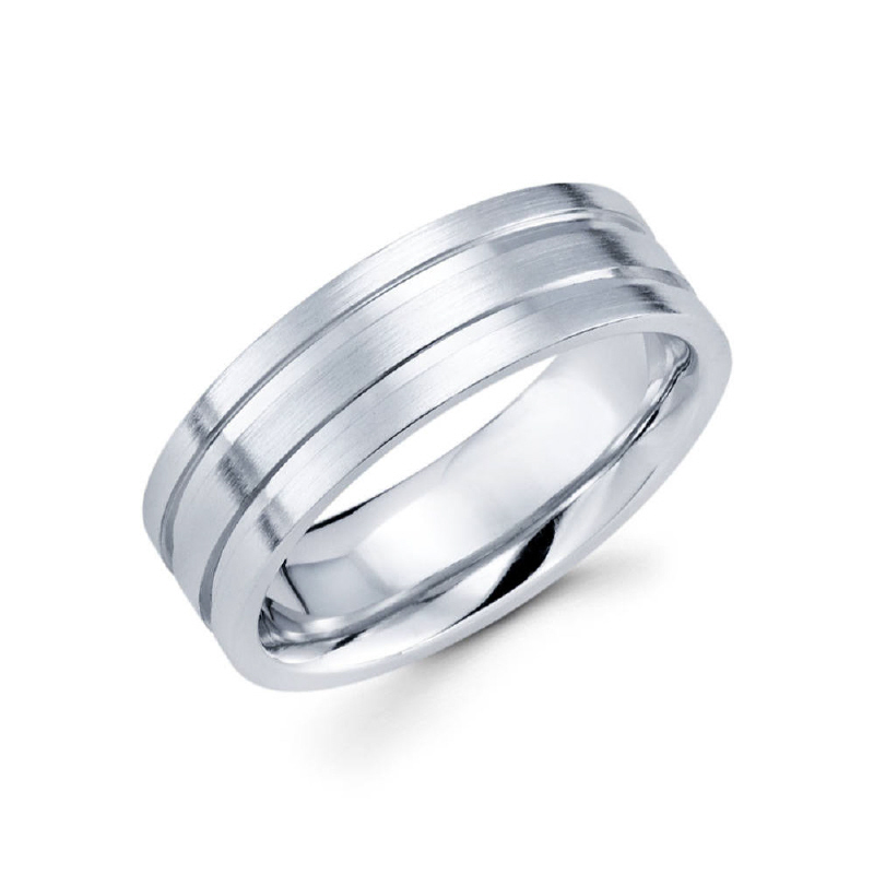 7mm 14k white gold satin finished men's wedding band consists of two parallel diamond cuts on the outter sides.