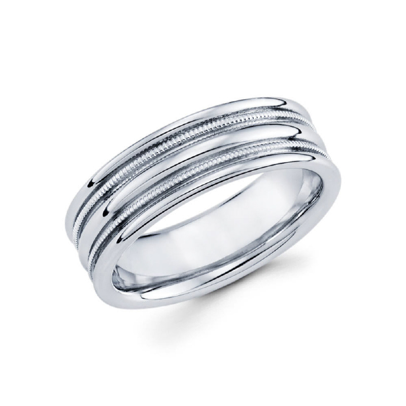 7mm 14k white gold high polish finished men's wedding band contains milgrain in between the parallel cuts and gives off the illusion of three rings in one.