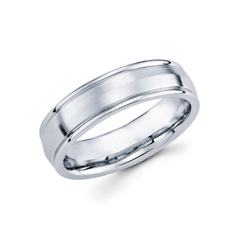 6mm 14k white gold satin finished men's wedding band features a serrated groove along the middle of the ring along with high polished edges.