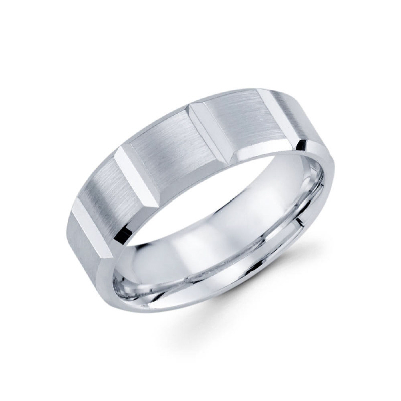 7mm 14k white gold high polished men's wedding band consists of strong vertical grooves along the center for a refined, industrial look.