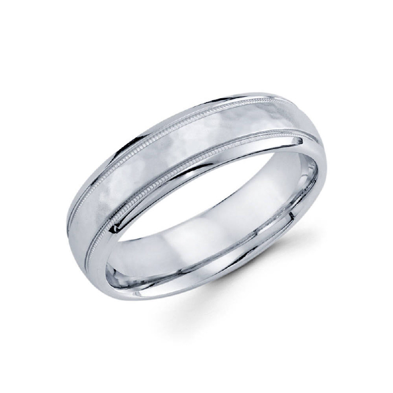 6mm 14k hammer finished men's wedding band features bold milgrain/high polished edges.