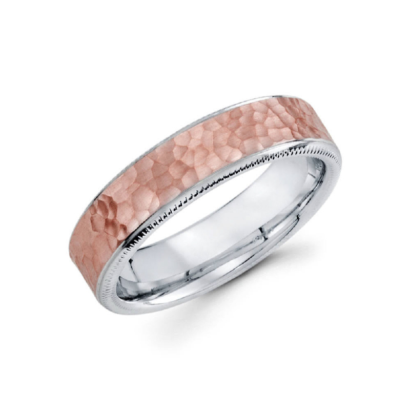 6mm 14k two tone hammer finished men's wedding band consists of a rose gold top with high polished white gold milgrain edges.