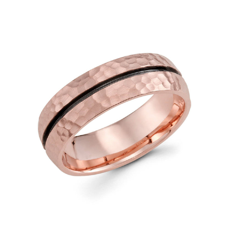 7mm 14k rose gold hammer finished men's wedding band consists of a black rhodium cut throughout the center of the ring.