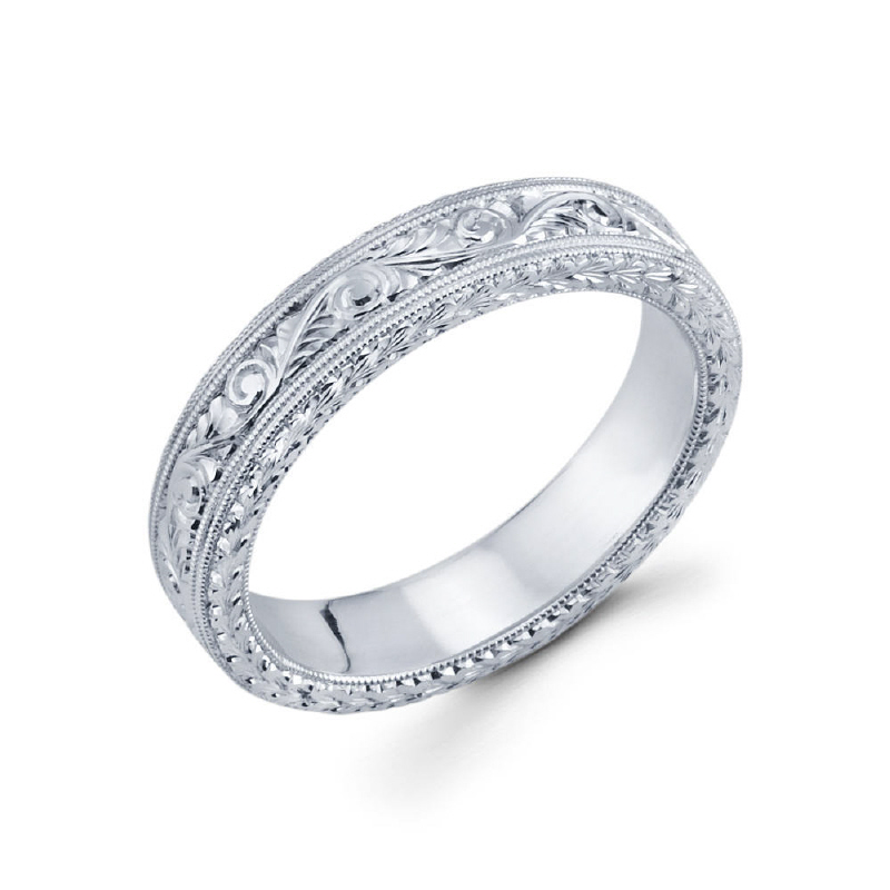 5mm 14k white gold men's wedding band has flower patterned hand engraving all around the ring accented by milgrain on the inner parts of the edges.