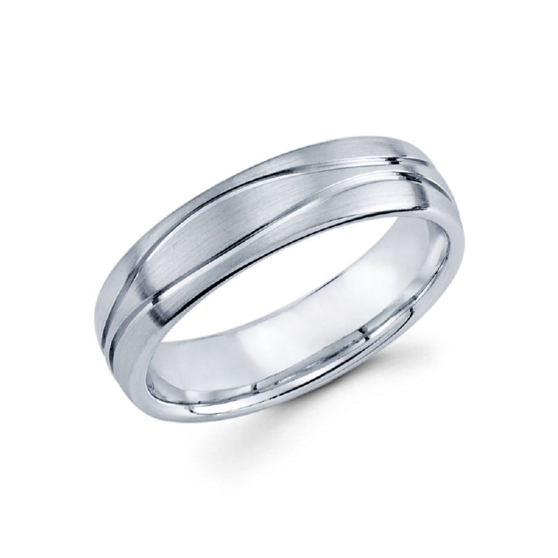 6mm 14k white gold satin finished men's wedding band features two wavy synchronized cnc cut patterns throughout the ring.