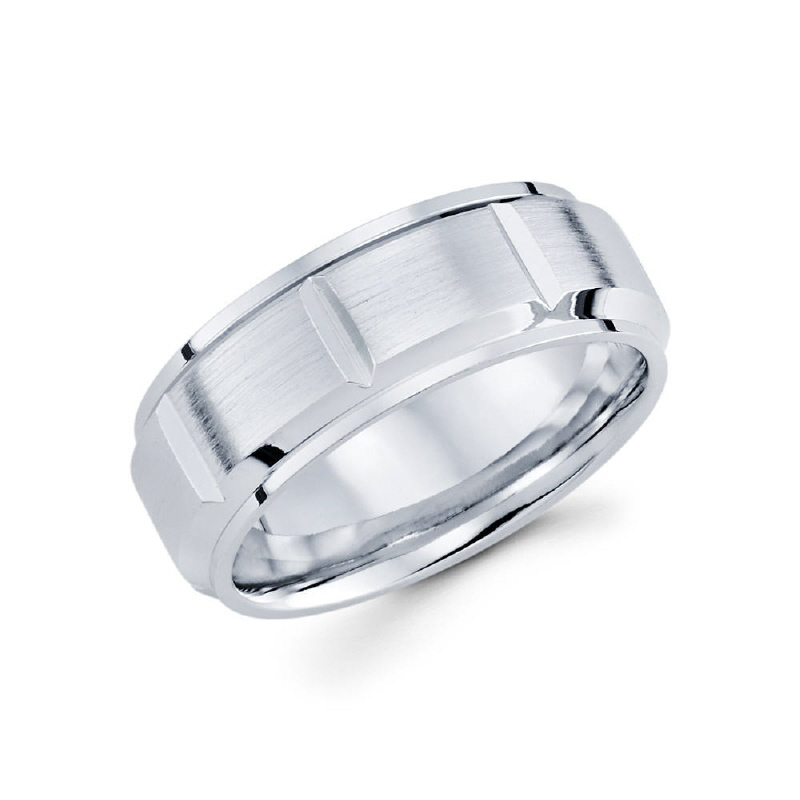 8mm 14k white gold high polished men's wedding band consists of strong vertical grooves along the center and high polished edges for a refined, industrial look.