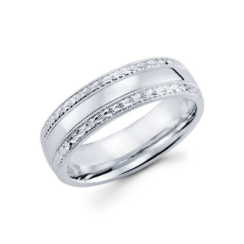 6.5m 14k white gold men's wedding band features a high polish center along with beautiful hand engraved sides.