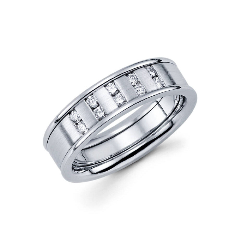 7mm 14k comfort-fit channel set men's diamond band features a satin finish middle with a strong high polished round edge that surrounds 10 beautiful round ideal-cut diamonds. Total diamond carat weight is approximately 0.32ct.