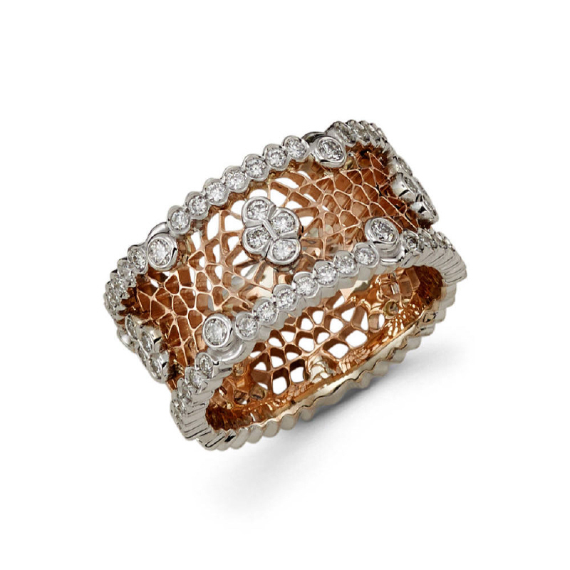 11m 18k two tone ladie's wedding band features a rose gold center resembling a honeycomb along with white gold patterns rested on top as well as on the sides which contain diamonds a pave setting. The ring consists of 90 ideal diamonds accumulating to a