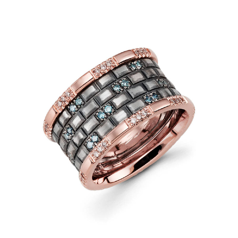 11mm 14k two tone ladie's wedding band features a unique black rhodium brick pattern along the center consisting of blue diamonds along with rose gold edges holding white diamonds in a pave setting. Total diamond carat weight is approximately 0.70ct.