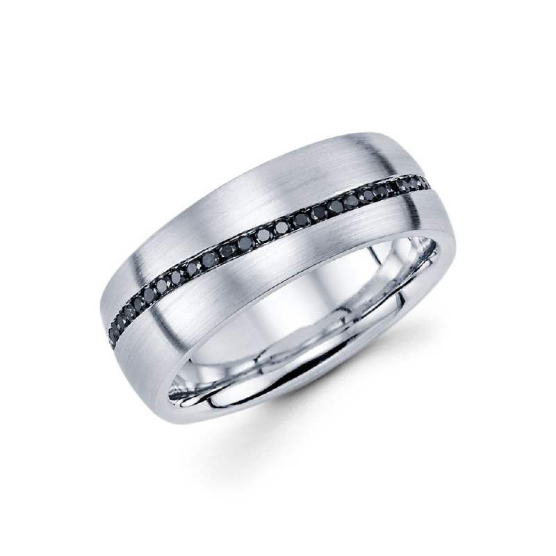 8mm 14k comfort-fit channel set satin finished eternity band features 52 round cut diamonds in a zig zag orientation. Total diamond carat weight is approximately 0.60ct.