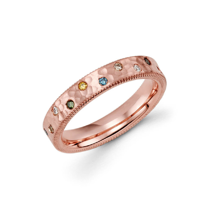 This 6mm 14k rose gold ladie's band comes with a burnished setting of multiple colored diamonds in a zig zag formation with a milgrain side finish. Total diamond carat weight is approximately 0.21ct.