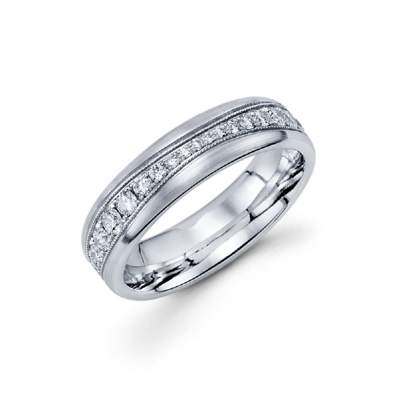 5.5mm 14k ladie's eternity band is set with 46 graduate style diamonds in a pave setting in between milgrain sides. Total diamond carat weight is approximately 0.41ct.