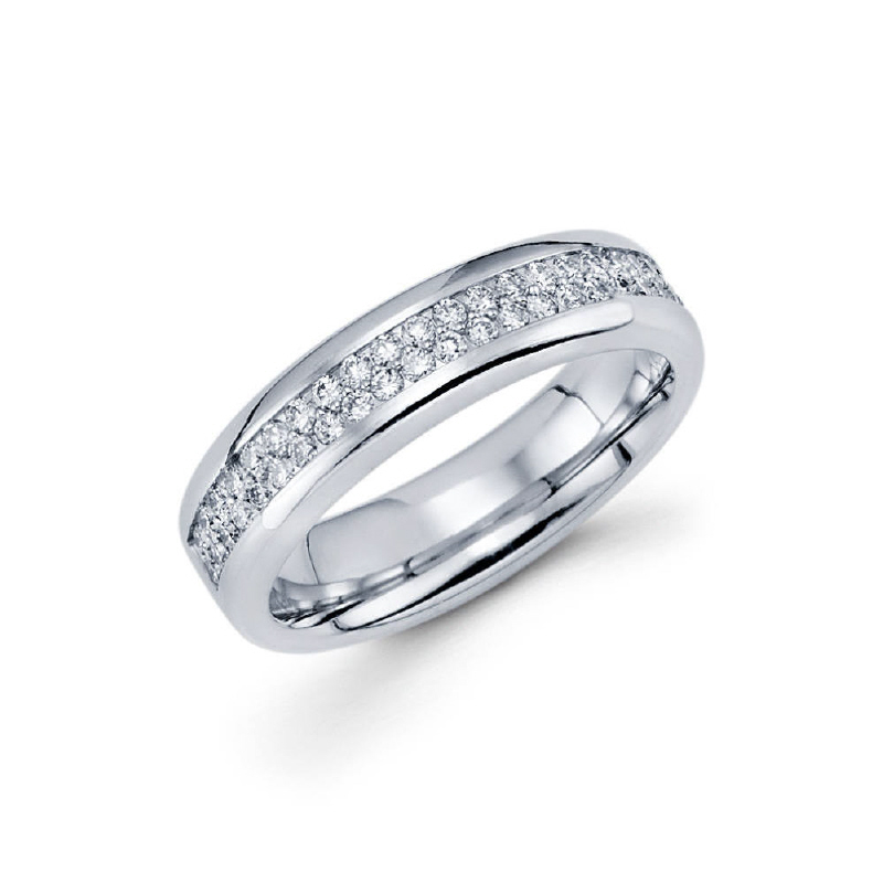 5mm 14k pave set ladie's band features a high polish all throughout with 46 round ideal-cut diamonds set in double rows of 23 in the middle. Total diamond carat weight is approximately 0.41.