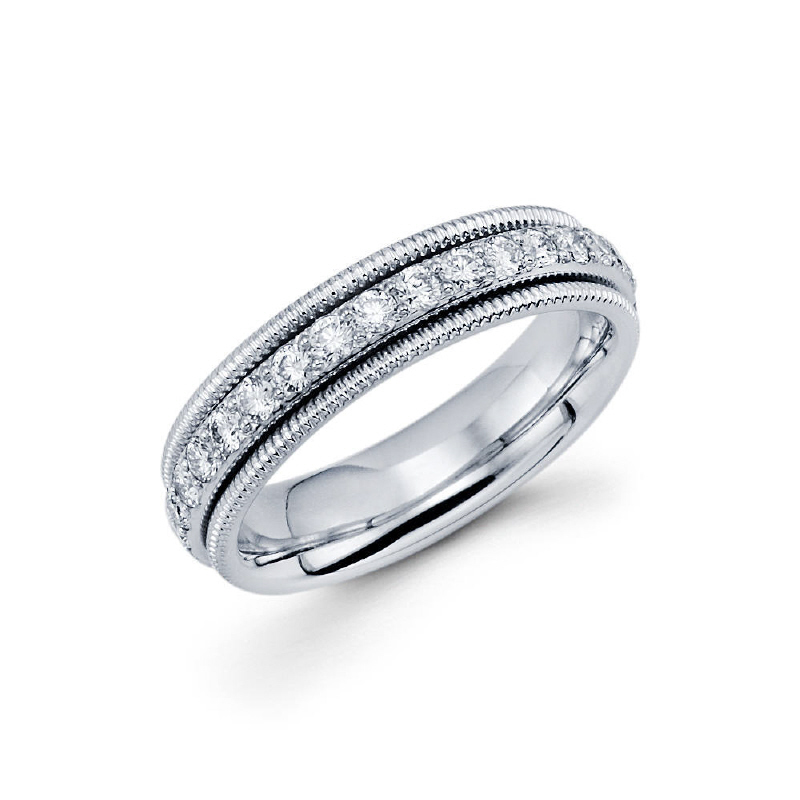 This beautiful 5mm 14k ladie's eternity band has 32 round ideal-cut diamonds.The central part of the ring which holds the diamonds freely spins for a truly unique effect. Total diamond carat weight is approximately 1.00ct.