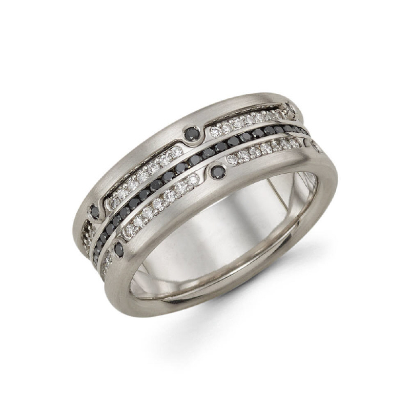 9mm 14k men's eternity band contains a rare combination of channeled and burnished set diamonds which truly sets it apart from most others. It has 3 rows of black and white diamonds which makes it stand out like no other. Total diamond carat weight is ap