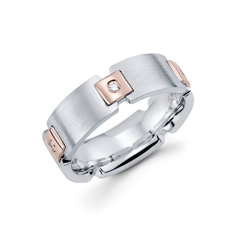 This unique two tone 7mm 14k rose gold and white gold men's wedding band has a high polish finish for the rose gold parts and a satin finish for the white gold areas. Containing 5 beautiful round ideal-cut diamonds in a burnished setting. Total diamond c