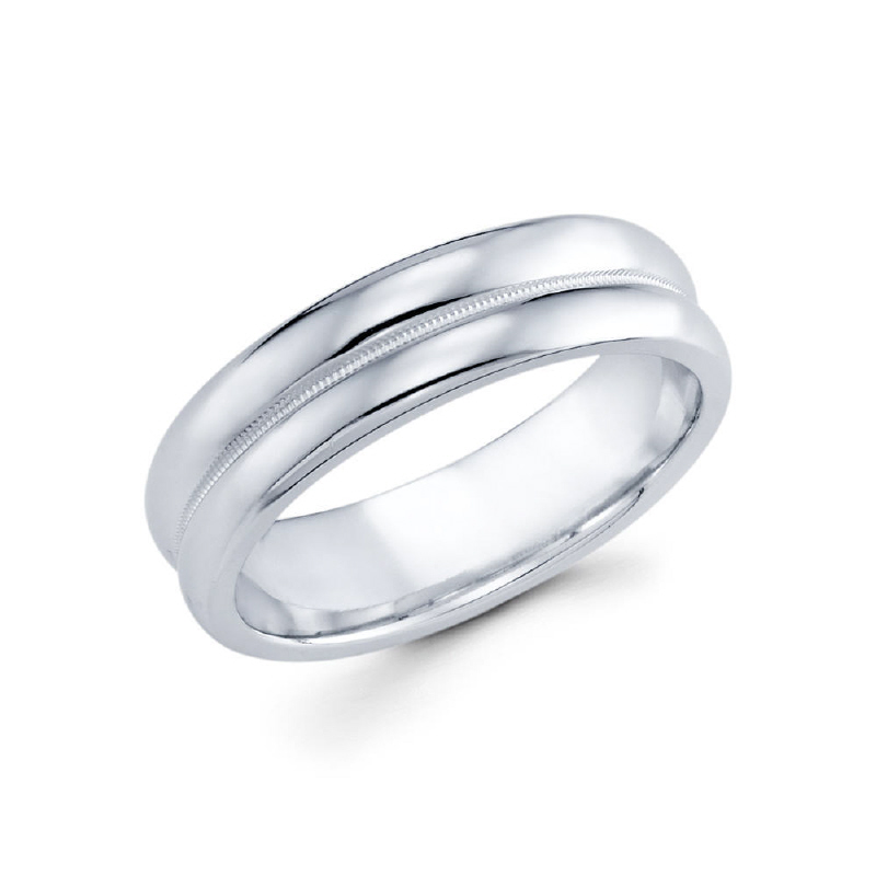6mm 14k white gold high polish finished men's wedding band gives off the illusion of two rings in one.