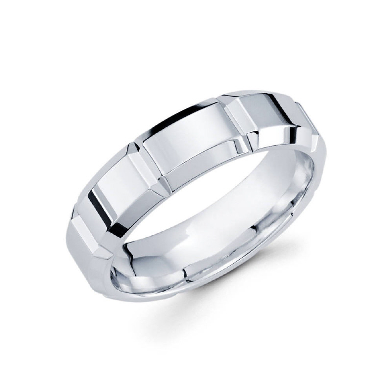6mm 14k white gold high polished men's wedding band consists of strong vertical grooves along the center for a refined, industrial look.