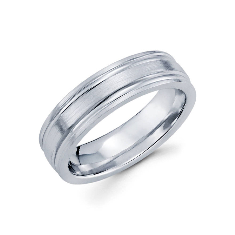 6mm 14k white gold satin finished men's wedding band consists of two parallel diamond cut lines on the outsides.