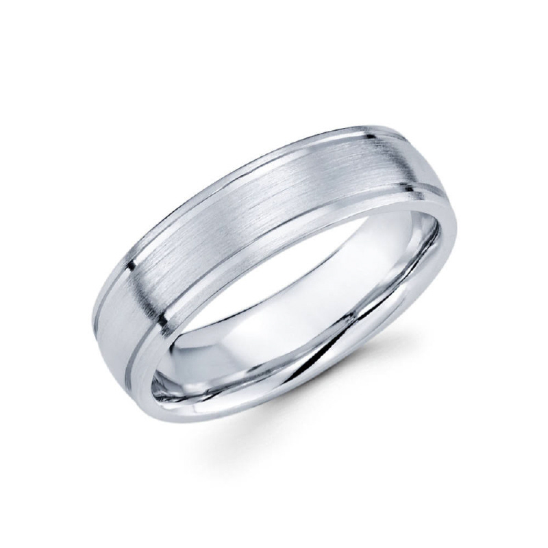7mm 14k satin finished men's wedding band consists of two parallel diamond cut lines on the outter parts of the ring.