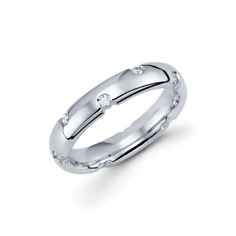 4mm 14k burnish set high polished dome ladie's eternity band features 10 round cut diamonds in a zig zag orientation. Total diamond carat weight is approximately 0.35ct.